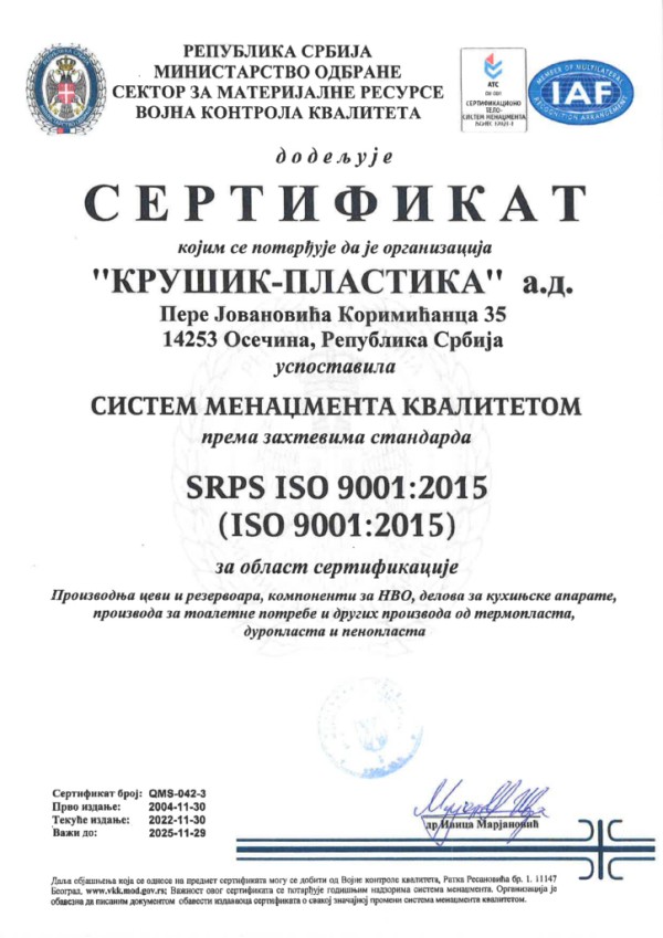 Since November 30, 2004, Krušik-Plastika a.d. has been among the companies certified for their quality management system in accordance with ISO 9001 and SORS 9000 standards. Our organization is ready to compete in tenders across Europe with timely delivery and consistent product quality. By maintaining a leading position in customer relations, we help clients define the best solutions that fully meet their needs. Products and services under the Krušik-Plastika a.d. brand have reached a world-class level of quality and have become recognized and respected both domestically and internationally. Every employee is responsible for performing their work with quality, precision, and without error. The Military Quality Control Department of the Ministry of Defense of the Republic of Serbia has extended the validity of existing certificates (ISO 9001:2015 and SORS 9000/14) until November 29, 2019.